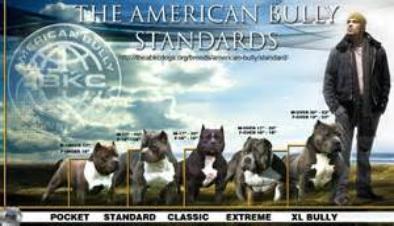 Breed Standard For The American Bully: SCROLL DOWN FOR THE AMERICAN BULLY XL CHARACTERISTICS: The American Bully is a well rounded, reliable, trustworthy, and ideal family companion. The breed is very outgoing with an eagerness to please, while also maintaining a guardian role of his owners and property. An excellent companion dog to an owner who fully understands his desire to be loyal and protective, while gentle and loving. GENERAL APPEARANCE: The American Bully should give the impression of great strength for its size. A medium size dog with a muscular body. Agile and graceful in its movement, keenly alive to his surroundings. He should be stocky, not long-legged or racy in outline. His courage is proverbial. HEAD: Medium length, deep through, broad skull, very pronounced cheek muscles, distinct stop, and high set ears. The muzzle should be of medium length, rounded on upper side or slightly squared to fall away abruptly below eyes. The jaws are well defined, with the under jaw appearing strong. TEETH: Upper teeth to meet tightly outside lower teeth in front or scissor bite accepted. Under shot or over shot mouths are not desirable. Lips close and even, some looseness accepted, but not preferred. EYES: All colors except albinism. Eye shape would be round to oval, low down in skull and set far apart. EARS: Natural or Cropped. NOSE: All colors acceptable. NECK: Heavy, slightly arched, tapering from shoulders to back of skull, and of medium length. No looseness of skin. FOREQUARTERS: Shoulders are strong and muscular with blades wide and sloping. Forelegs should be straight, while a slight turning outward of the feet is accepted, but not preferred. Large or round bones with pastern upright, with no resemblance of bend in the front. Forelegs should set rather wide apart to permit chest development. BODY: The back should be fairly short. Slight sloping from withers to rump or straight is accepted with gentle short slope at rump to base of tail. Slightly higher rears are allowable, but not preferred. Well-sprung ribs, deep in rear and all ribs close together. The chest should be deep and broad. HINDQUARTERS: Hindquarters should be well muscled, let down at hocks, turning neither in nor out. Stifles should be well bent. Feet should be of moderate size, well arched and compact. TAIL: Short in comparison to size, low set, tapering to a fine point; not curled. Not docked, kinked or knotted. COAT: Short, close, stiff to the touch, and glossy. Very little grooming is required to keep the coat healthy. COLOR: All colors and patterns are permissible expect the color merle. SIZE: Height and weight should be in proportion. A height of about 18 to 21 inches at shoulders for the male and 17 to 20 inches for the female is to be considered preferable. There is no particular weight for the breed. GAIT: The American Bully should be springy and drive off the rear. He should appear agile and graceful while in full movement. Breed Standard For The XL American Bully CHARACTERISTICS: The XL American Bully is a well rounded, reliable, trustworthy, and ideal family companion. The breed is very outgoing with an eagerness to please, while also maintaining a guardian role of his owners and property. An excellent companion dog to an owner who fully understands his desire to be loyal and protective, while gentle and loving. GENERAL APPEARANCE: The XL American Bully should give the impression of great strength for its size. A Large size dog with a muscular body. Agile and graceful in its movement, keenly alive to his surroundings. He should be stocky, not long-legged or racy in outline. His courage is proverbial. HEAD: Medium length, deep through, broad skull, very pronounced cheek muscles, distinct stop, and high set ears. The muzzle should be of medium length, rounded on upper side or slightly squared to fall away abruptly below eyes. The jaws are well defined, with the under jaw appearing strong. TEETH: Upper teeth to meet tightly outside lower teeth in front or scissor bite accepted. Under shot or over shot mouths are not desirable. Lips close and even, some looseness accepted, but not preferred. EYES: All colors except albinism. Eye shape would be round to oval, low down in skull and set far apart. EARS: Natural or Cropped. NOSE: All colors acceptable. NEC:K Heavy, slightly arched, tapering from shoulders to back of skull, and of medium length. No looseness of skin. FOREQUARTERS: Shoulders are strong and muscular with blades wide and sloping. Forelegs should be straight, while a slight turning outward of the feet is accepted, but not preferred. Large or round bones with pastern upright, with no resemblance of bend in the front. Forelegs should set rather wide apart to permit chest development. BODY: The back should be fairly short. Slight sloping from withers to rump or straight is accepted with gentle short slope at rump to base of tail. Slightly higher rears are allowable, but not preferred. Well-sprung ribs, deep in rear and all ribs close together. The chest should be deep and broad. HINDQUARTERS: Hindquarters should be well muscled, let down at hocks, turning neither in nor out. Stifles should be well bent. Feet should be of moderate size, well arched and compact. TAIL: Short in comparison to size, low set, tapering to a fine point; not curled. Not docked, kinked or knotted. COAT: Short, close, stiff to the touch, and glossy. Very little grooming is required to keep the coat healthy. COLOR: All colors and patterns are permissible expect the color merle. SIZE: Height and weight should be in proportion. A height of about 19 to 22 inches at shoulders for the male and 18 to 21 inches for the female is to be considered preferable. There is no particular weight for the breed but should be proportioned to height. GAIT: The American Bully should be springy and drive off the rear. He should appear agile and graceful while in full movement. |